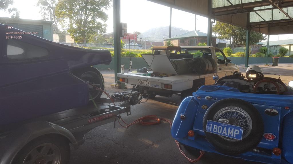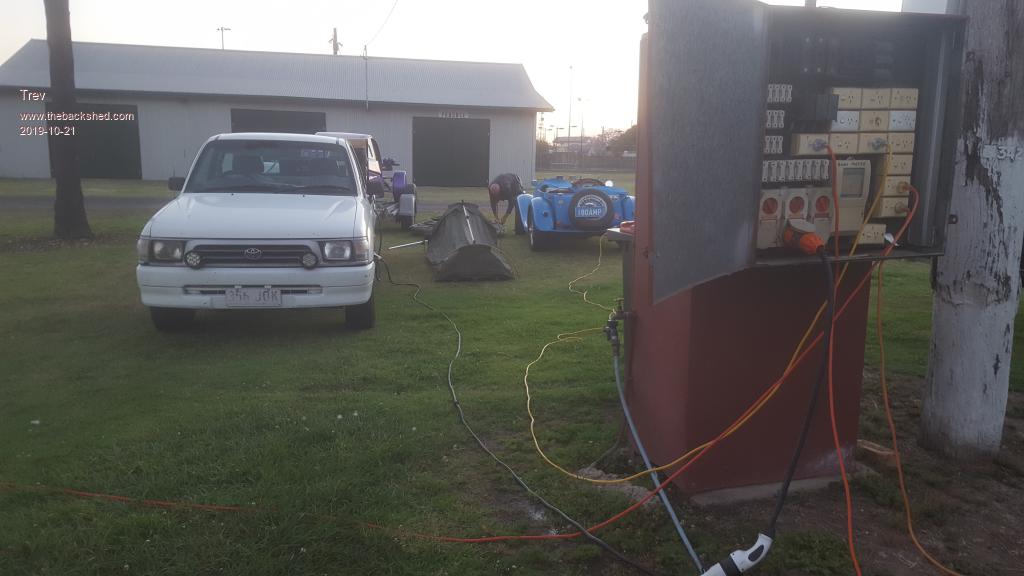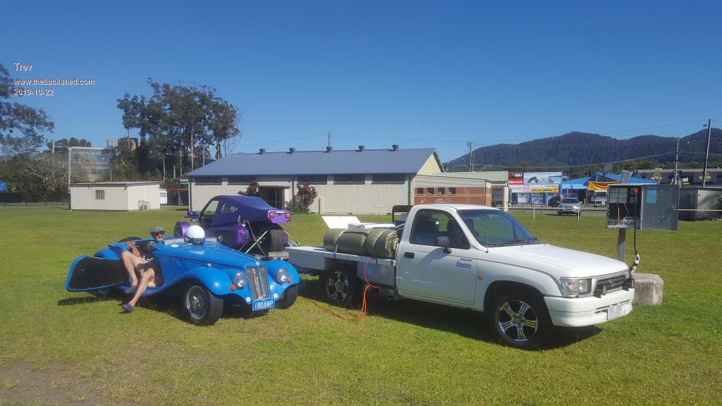 At Mercato shopping centre, we looked at the charge plan more. We decided to skip Lismore and just go to Maclean. At dumping time (in the cane paddock), we found that Grafton showgrounds had 3ph and camping allowed. So the plan was then to try to make it all the way to Graften. We considered the power we had and figured it would be tight but possible. We had to do a double dump to MGEV and EV Hilux would use the rest from T-Rev. We made it with all 3 vehicles very empty.