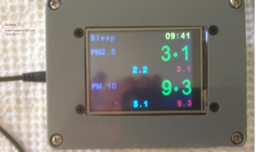 Hi Phil, Thanks for tidying up my "code" - I guess that is what the "Code" button is for?? (Jim's MMEdit formats things to look better so the typos are less apparent.) Here are two pictures: The display shows current P2.5 and P10 values, in larger font, and the minimum and maximum values to date (Cyan and Red). The grey word "Sleep" changes to a green "Awake" when the sensor is working. The top left time is from my HC-12 network as described above. There is no graph (yet) but I graph all my HC-12 inputs on my PC. The other pic shows you can just fit both sensors, an HC-12 and a LCD BackPack in the box. There is a bend in the tube feeding the SDS011 (and its covered in black heat shrink) to reduce the light getting to the sensor. I've enlarged the 4 holes at the back of the box to exhaust air from the SDS fan. I have yet to isolate the VOC sensor from the air inside the box. OK? Andrew |