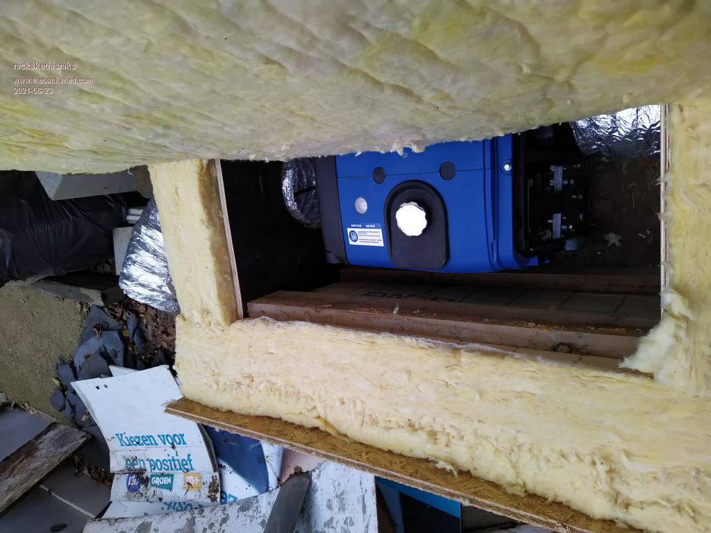 The unit Hyundai unit is capable of doing 3.2kva but I'm only using it at 1000va most of the time, max 1.6kVA. So no heat concerns, and probably better for long term use. It has a remote for turning it on or off, so if I'm on the right spot I can start it in the house. With about 7liters I can run around 8h, and let it shut off itself on heavy clouded days. The generator is selfcooling so I did screw the side off for a better fit, but no extra fan was needed for the power level I'm using.