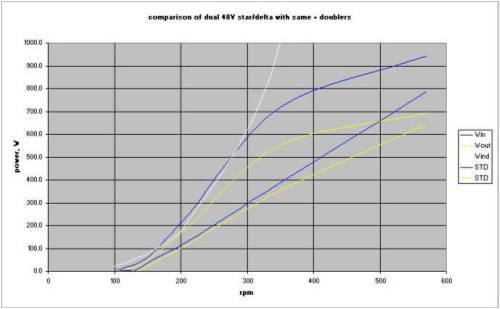 Hi readers, Phill has asked me to publish the first set of graphs. This will give some idea of typical 80SP rewire outputs into 24V & 48V systems with star and delta configurations with and without a capacitor doubler. and what can be achieved with a dual combination as Phill is planning to configure. This is the first of a series of testing. These are not laboratory std results, but all measurements were done on the same day, in the same sequence, with the same instruments and the capacitors used in the doubler were 50uF non polarised type of > 400VAC ratings. The graphs are annotated and should not require explanations. These graphs only test one value of capacitance so far, for a doubler combination only, in parallel with existing rectifiers. 24V Star ![]()