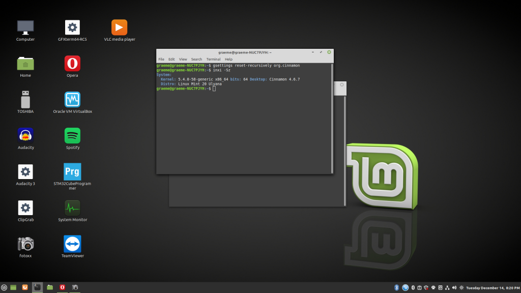 If you can't find it through the start menus (Windows key), I did find this one to run in a terminal: gsettings reset-recursively org.cinnamon while you are in the terminal enter: inxi -Sz and tell us what it gives. VK7JH MMedit |