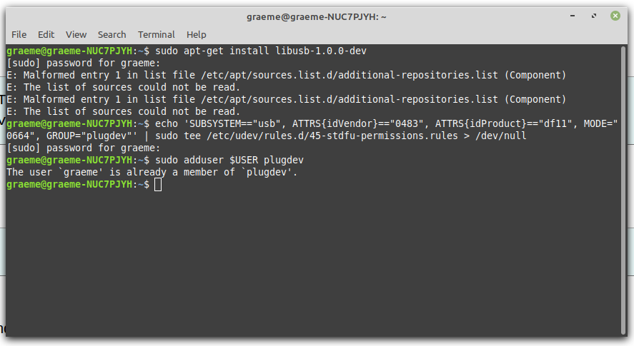 hi grogster, have you done BOTH of: echo 'SUBSYSTEM=="usb", ATTRS{idVendor}=="0483", ATTRS{idProduct}=="df11", MODE="0664", GROUP="plugdev"' | sudo tee /etc/udev/rules.d/45-stdfu-permissions.rules > /dev/null (as a single line), AND: sudo adduser $USER plugdev just cut (from this message) and paste each of the lines into a command terminal. both are CASE SENSITIVE, and both will prompt for your password. the purpose of the first line is to create a file called /etc/udev/rules.d/45-stdfu-permissions.rules containing the one line of text: SUBSYSTEM=="usb", ATTRS{idVendor}=="0483", ATTRS{idProduct}=="df11", MODE="0664", GROUP="plugdev" this allows access to the VDI/PID 0483:df11. cheers, rob :-) |