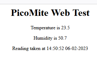 With a slight modification to Peters code, a simple weather station is born. Page refreshes ever 15 seconds and the DHT22 is read every 3 seconds to allow for any bad readings. BAS file: DIM buff%(512) DIM mystring$="PicoMite Web Test" DIM FLOAT mytemp, myhumid, oldtemp, oldhumid DIM mytime$ TIMER = 3000 WEB ntp 11 DO poll IF TIMER > 3000 THEN doread LOOP ' SUB poll LOCAL p%, t% FOR a%=1 TO MM.INFO(MAX connections) LONGSTRING CLEAR buff%() WEB tcp READ a%,buff%() p%=LINSTR(buff%(),"GET") t%=LINSTR(buff%(),"HTTP") IF LLEN(buff%()) THEN PRINT "_________________________________________________" s$="" IF (p%<>0) AND (t%<>0) AND (t%>p%) THEN s$=LGETSTR$(buff%(),p%,t%-p%+4) PRINT "String is ",s$ ENDIF IF INSTR(s$,"small") THEN PRINT "sending picture" WEB Transmit FILE a%,"small.jpg","image/jpeg" ELSEIF INSTR(s$,"favicon") THEN PRINT "sending icon" WEB Transmit FILE a%,"favicon.ico","image/vnd.microsoft.icon" ELSEIF INSTR(s$,"HTTP") THEN PRINT "sending page" WEB transmit PAGE a%,"st_test.html" ENDIF NEXT a% END SUB SUB doread BITBANG HUMID GP17, mytemp, myhumid IF mytemp > 999 THEN mytemp = oldtemp myhumid = oldhumid PRINT "_"; ELSE oldtemp = mytemp oldhumid = myhumid PRINT "*"; ENDIF mytime$ = TIME$+" "+DATE$ TIMER = 0 END SUB HTML file: <html> <head> <title>Stowport Test</title> <meta http-equiv="Refresh" content="15"> </head> <body> <h1 align="center">{mystring$}</h1> <p align="center">Temperature is {mytemp}</p> <p align="center">Humidity is {myhumid}</p> <p align="center">Reading taken at {mytime$}</p> </body> </html> Result: ![]() The system is undergoing a soak test. Jim VK7JH MMedit |