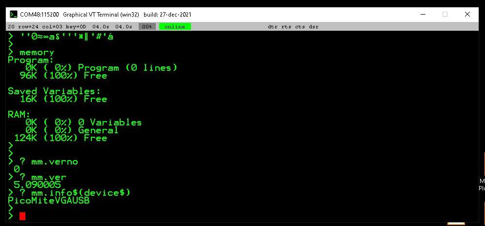 I good thought. I have trouble locating a USB2 port. I plugged a USB hub into the laptop, and plugged the PicoVGAUSB board into that. I didn't get the "unrecognized USB device" message, but also didn't get a COM port. The heartbeat LED is flashing. PicoMite, Armmite F4, SensorKits, MMBasic Hardware, Games, etc. on FOTS |