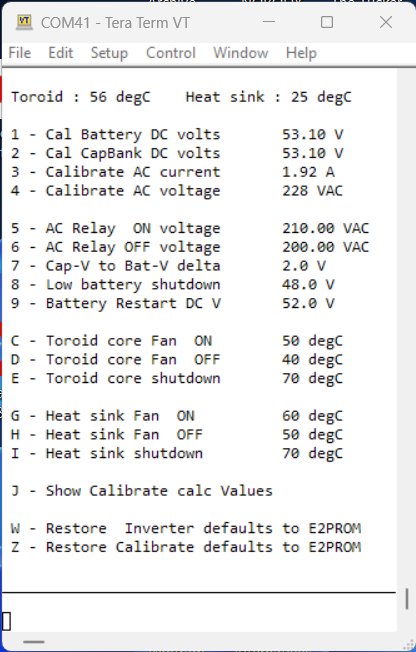 For anyone wondering about the available settings: I thought this might wet the appetite for getting involved in building one of these Inverter Controllers and Power boards. I've made some changes to the Menu layout in my test code: This will likely NOT MATCH the release Firmware, but the options will be there. Here is a screen shot of the Nano Inverter running my "slightly revised" version of the Nano menu and Wiseguys power stage. It's running with a very small load. The settings can be changed with a running inverter and changes are usually reflected as the menu reloads. Note: I have the Software AC Over current set to a low 5A for testing. There is a separate "hardware current" detect on the controller feeding the Nano, this signal will trip the Inverter and Stop it with the Over-current LED lit, the Reset switch must be pressed to restart the Inverter - or power Off. Settings [6] and [7] are only test values I was using for testing at 26v DC. They depend on: Menu [6] The battery type: The minimum battery discharge voltage. Menu [7] Restart inverter: The battery voltage indicating sufficient charge. Menu [A] to [G] are Defaults, Toriod and heat sink have test 10k resistors. ![]() . Edited 2024-04-07 11:58 by KeepIS NANO:Inverter V 8.2ks - Linux AvrDude GUI script V4.1 |