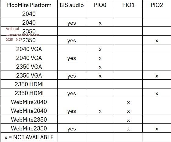@ Tony, at the moment I only tested the programs with the pure versions of the firmware. No usb,vga,hdmi or i2s dac. I know for VGA/Hdmi the RPs uses PIO 0(shared i2s-dac on 2040) and the 2350-firmware use PIO 3 for i2s-dac. I did not find a full overview of the used PIOs at the moment. @ Don, did you test the new version? Albert |