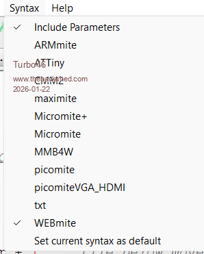 Hi Jim, I'm working with MMBasic for DOS and there are some keywords not being highlighted: Const Randomize While Exit I have added them to dos.tkn and restarted MMEdit (the latest) but that did not work. I had the idea that they are all in the one file now but if that's right I can't find it. That was under c:\program file but I found another dos.tkn under c:\users. Is that the one I should be changing? Bill Keep safe. Live long and prosper. |