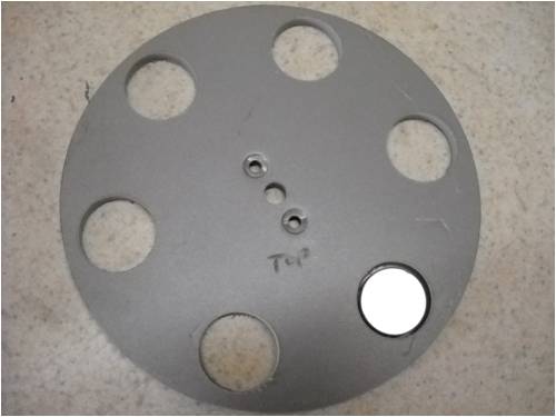 Here's all 6 holes cut in one plate with one 1" neo-magnet inserted