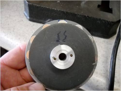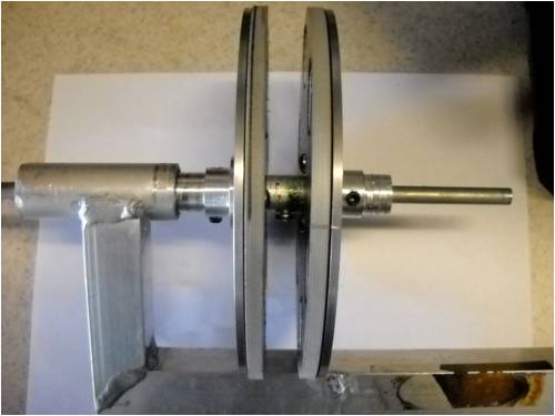 Anyway, it's Sunday morning here and I pushed the two magnet wheels together after first fashioning a small aluminum spacer thingy (with a set screw, but now I don't know what I was thinking nor why I took the time to do that set-screw part) so they wouldn't get permanently stuck together and here's what it looks like: