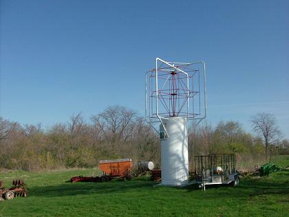 Hi Oscar4u, The size is 24 feet from the floor surfice of the foundation to the top of the upper frame. The tube its self is approx. 5 feet 8 inches dia. x 13 feet 4 inches in height. It has 1/4 inch side wall thickness, and was salvaged from a steam boiler refit...was part of the old exaust stack. I don't know what rpm it will run for a given wind speed, I could tell you what the mathmatics says it should run at, but at this point it would be just a guess. I'm hopeing for 200 rpm with 10 mph wind, but would be satisfied with half that. It may surprise everyone and do better or it may do worse too. But you'r right it should have lots of torque. I'm think along the lines of 12 volt DC to charge storage batteries and also an air compressor to charge a 500 gallon tk. for the shop, but have'nt made final plans yet. The wings themselves are approx. 9 feet 6 inches tip to tip and 2 feet wide,(cord). .....Mac46 I'm just a farmer |