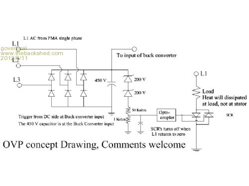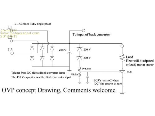 Hi, I order the parts before I understood Steve’s circuit. I do not know if the Zeners will breakdown at 400 volts. The trigger signal is from the DC side at the buck converter input. L1 is from the AC side; single phase; from the PMA. If the SCR fires it will reset when L1 returns zero. Load could be a heating element so the PMA stator would stay cool. May be a possible solution for the input over voltage protection circuit. Comments welcome
