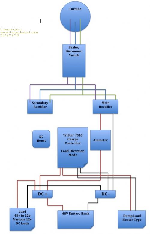 At first I just had a diode on the output, as it was loading the turbine down, I added on the in input. This stopped the loading down and the turbine was spinning at the normal speed, the voltage reading was normal