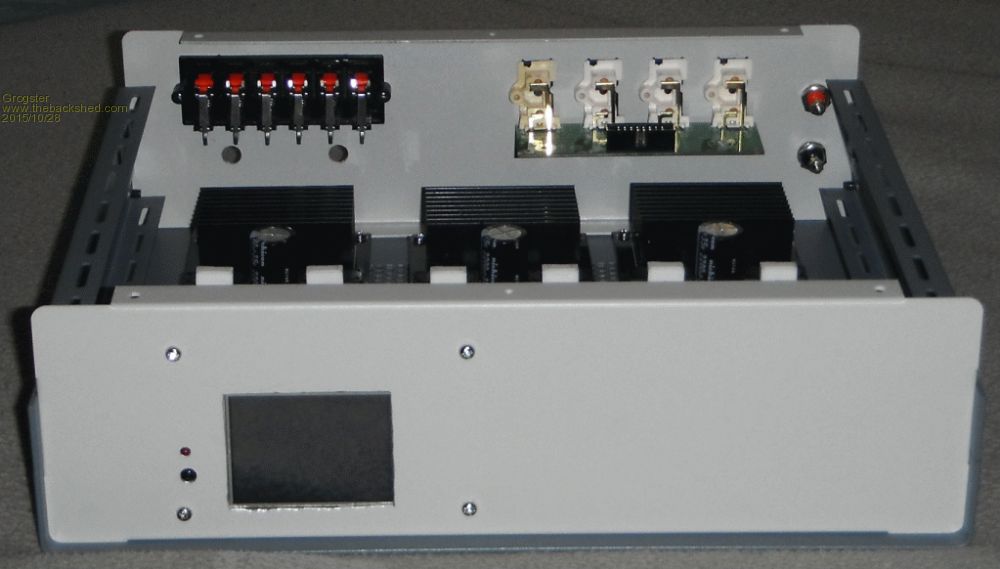 The red and black hanging off the left side of the box is the 32v input, which will connect to the buck converter, the 12v output of which, will power the circuits. With any luck, I will be able to fire it up tomorrow and do some preliminary testing.