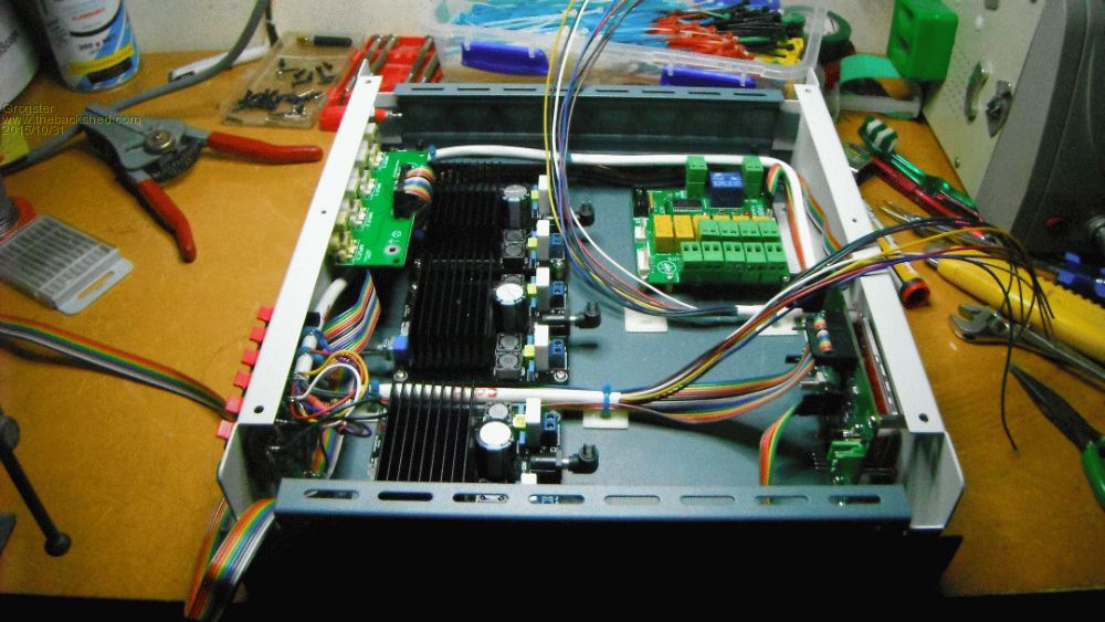 However, you can see how the 'COLD' cable connects all the negatives to the respective speaker outputs, and the 'HOT' cable comes from the de-thump/routing board which will switch speakers on and off as desired etc. There is a third 8-core cable to go in yet, connecting the amp hot outputs to the relay board. Also still have to fit buck-regulator on main PSU rail to supply 12v to the MM-based electronics and relay board, and also still have to install and route the main 32v bus. I will post more photos when the wiring is complete. Almost ready to actually do some testing!!!!