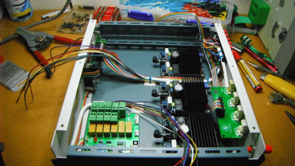 The three boards on this thread are easy enough to spot, but the new cast members are the 6-way speaker connector, and 3x amplifier boards. These boards are 100W stereo power amp modules in class-D arrangement. At 32v, these amps can deliver about 92W RMS @ 10% THD. That is essentially the standard measurement figure, but 10% THD is not a good thing, really. Looking further at the datasheet, the amp is capable of about 70W RMS @ 0.1% THD, which is a much better distortion figure. Hell, for fifteen bucks, it's not a bad amp!!!