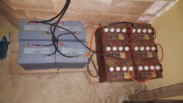I started off small, which most of us do, with a bank of 4 225AH 6V's batteries (grey colour in pic) and a kw of panels. A bargain came up, or so I thought and purchased 6 more 8v batteries (trojan) from a disused golf cart. Think they are bout 170Ah each, so that makes a grand total of around 550Ah @24v.
