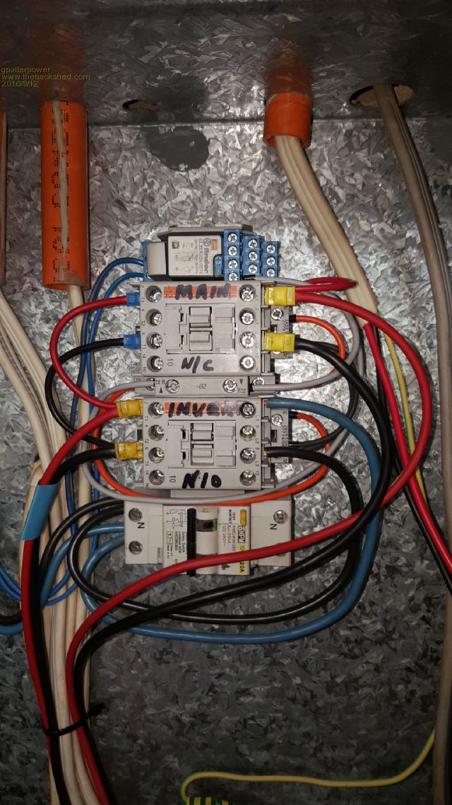 Hi Tinker, I was looking for something that was automatic to change from grid to inverter and this was the best I could think of. The 2 contactors are both 240v, powered by the grid and selection comes from the 24v c/o relay which in turn is powered by the volt detect relay on the power wall. The contactors are mechanically and electrically interlocked so there is NO chance that my inverter would ever feed into the grid. It makes for a pretty well automatic seamless transition between grid and inverter power. The RCD at the bottom was used for a while but I took it out of the equation due to dropping out with the change over. Its now just a connection point as the black and blue wiring was too short to reach. In the event of a blackout/brownout, both contactors will drop out for safety purposes. I then I can mechanically over ride the inverter contactor to feed the house. Fred , still on the lookout for some late model F&P's. if it aint broke dont fix it!! |