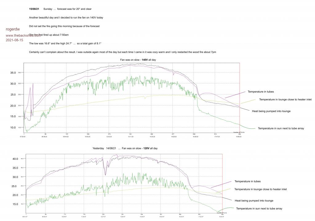 Actually I had wondered the exact same thing, but didn't really have much idea how to do it ... then I figured even if I bought or built one ... it's going to tell me that more sunlight equals more output, and I can't change the amount of sunlight no matter how hard I try, so I forgot about it. Yes you could be right, though I find that when I come in and it feels cozy warm still ... I think that it's nice and comfortable (maybe bordering on warm enough) ... but when evening comes around it still cools off pretty quick ... and if I don't light the fire reasonably soon, suddenly we're all cold. It also now has me thinking about what to try as the days get warmer. This morning as I was starting work I spotted a length of flexible ducting that I had bought but hadn't used yet ... so I took it in and fitted it on the end of the outlet. It then hung down to within a few inches of the floor and directed the warmth onto the tiles. The first thing I noticed an hour later was that the temperature sensor that's only 18 inches off the floor (providing the room temp for the differential controller) was showing a couple degrees higher than usual ... and the one in the opposite corner of the room was a degree and a half lower than normal ... ie. both around the same temperature. The air coming out the duct didn't feel as warm as usual ... but then I noticed the duct itself was quite warm. The tile under the outlet became quite warm ... but the adjacent ones didn't heat much if at all. A question I am forming is ... if the air is directed to the floor (a wider area) and warms that up more ... will that mean the room temperature will not go so high ... but store more heat for our heatsoaking aim? Haha, I wondered where you were going for a moment. Just as well they're not likely to be reading the forum. Yes, it is a slow process and hopefully the big one will be a lot quicker. Sorry about the time scale ... coz the loggers record every minute, it spits out the data as a number of 'points' ... The problem is that the related time scales aren't anything sensible like every 10 or 15 minutes ... so I have to physically type in the actual times for every chart ... just too time consuming to do. I find that if I'm reading it on a pc ... I hold down the ctrl key and roll the mouse thumbwheel to zoom in so I can read it. It's a nuisance, but it works well enough. That's gotta make you feel good seeing those sort of numbers. Where's the smoke coming from, have you got fires already? Sorry to hear that, must be frustrating. Still, always plenty of new ideas to try ... or at least dream up, if you can't get out to pick up what you need to try them. Sounds like the topic for a new video? Yeah it doesn't feel right and is hard to feel motivated when you know you can't make use of it for 6 months. That's why I desperately wanted to have my new one up before the cool season finished ... otherwise it'll go on the backburner too ... and then I'll still only get it going half way through next winter. I did look at prices for those things but the cheapest I saw was up around $180 ... right up to $800+. Is there any value in monitoring those readings at all? As I mentioned above, I figured it wasn't worthwhile so just canned the idea. Cheers, Roger |