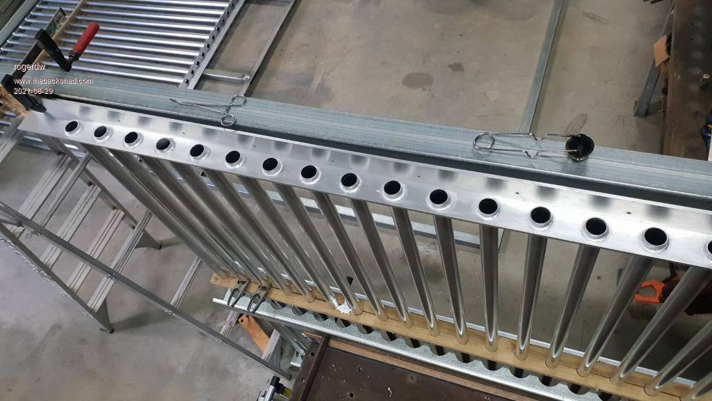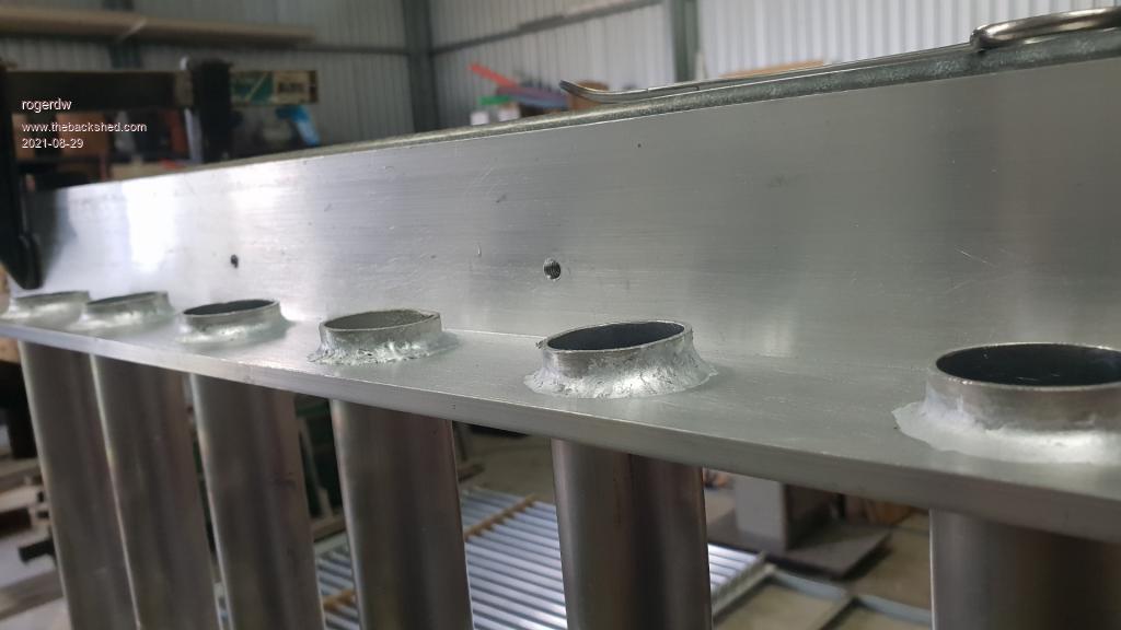 Thanks very much, that is very kind of you. I never had a result anything like that while I was experimenting with the brazing rods ... that's why I wasn't going to bother with them. Actually what did sway me (apart from the shockingly bad first weld attempts) ... was watching a couple more youtube videos on the rods. Most of the videos demonstrating the rods focus on welding a hole punchd in the bottom of a drink can ... ... but I kept looking for a video on welding thick material. Once I watched that, I felt a lot more confident. Yeah, good point. I realised as I was welding, that if I do try to weld the other side ... to get it hot enough to braze ... it will also melt the top side again ... and I'll end up with the pipes all shifting or with "dry joints". That lump that ran down the pipe in the last photo ... I used a chisel to try and slice it off. After 4 or 5 sharp whacks, hitting upwards, the weld broke and the pipe went up through the angle. So I had to weld that one back in. But it held remarkably well considering how hard I was hitting it. I tried two different types from ebay ... and with those I found I was melting the aluminium before the rods would melt. Though to be fair, now that I understand how they are supposed to work, it may be worth another try. The third type I bought and have now just used are actually made in Australia. They are Ultrabond 3.2mm aluminium brazing rod ... and I bought them online from hampdon.com.au Go halfway down the page and they show them sold in lots of 5, 10 or 30. It was $49 for 30 rods plus freight ... see here You can also buy just one rod ... but $17.99!!! I kept thinking of something like that ... even thought about making something to crimp them in. Something like a pair of bolt cutters, so that when put it in the end of the pipe and close (or open) the handles ... it swells the tube just below the angle and above the angle to hold it in place. Yes, I saw them demo'd on a video and thought that might work ... would have allowed me to procrastinate for another week or three by ordering some ... but thought it was time to make some progress of some kind. Thanks Klaus. I haven't given up on welding aluminium, but I can certainly see me using these brazing rods again. You are right though about the heat ... you really need a big flame to heat a large area ... not an oxy type of flame with a tiny point of heat. I had bought a hose and fittings plus a burner for propane ... but when I went to assemble it to try it out today, I found one part was the wrong thread, so forget that. Fortunately a friend had loaned me his flame weeder and I just hooked it up to my bbq gas bottle and used that. It has 3 different ends ... 1", 2" and 3". The 1" seemed to work the best. Yes, if I was to do something like this again ... flaring sounds like a decent alternative. If I could flare it just below the angle and also above it ... it should be solid enough ... even if I ran a bead of silicone around it after to prevent any leaks. I do have a hydraulic crimping tool and I kept wondering if I could start with that and make some sort of tool to swell the pipe rather than compress it. Thanks Aaron, and yes it was a massive heat soak. And to make it worse I had it clamped to a great thick walled length of square tubing which soaked up even more. Goodness ... I'd have been very happy to have that tidy a job. Though I can see why you might have a preference for no leaks over looks. I've watched lots and lots of welding videos trying to work out how to do this ... and you guys amaze me how you just motor along, dipping the rod ... and come out with a beautiful finished product. Yes ... and in some ways it's a bit like soldering ... just a lot more heat! I'm glad you said that ... I don't feel so bad about not being able to get my TIG or oxy to work. Yes, I can understand that. The tubes were supposed to be virtually flush ... but somehow things shifted and I wasn't going to bother setting it all up again ... but it did cross my mind that it would be hard to get behind there Yep, I've finished the first side with 30 pipes, so just have to set it up again to do the other 30. Will be much easier second time around. Thanks for the encouragement Aaron, and everyone else as well. ![]() Cheers, Roger |