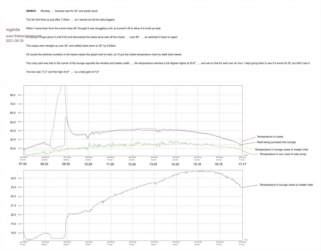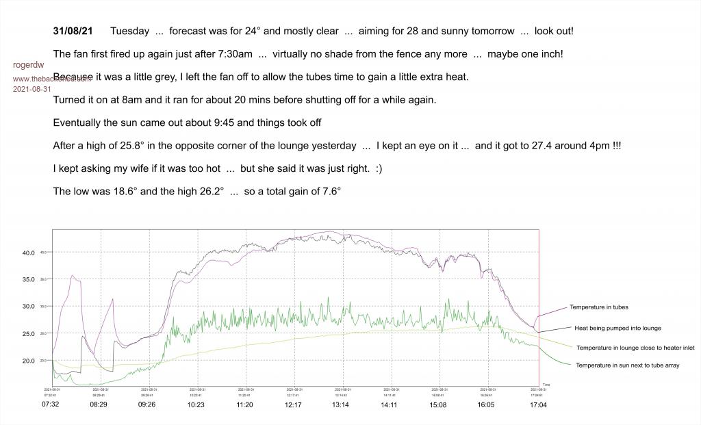 I haven't posted any charts lately so thought I'd throw one up. I did try turning it off this morning for a while to let it build up more heat, then promptly forgot to turn it back on. Certainly performed once I set it going again. I realise most of you would be turning on the air conditioner if you had it that hot!! ![]() Cheers, Roger |