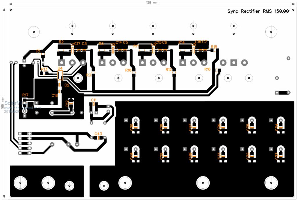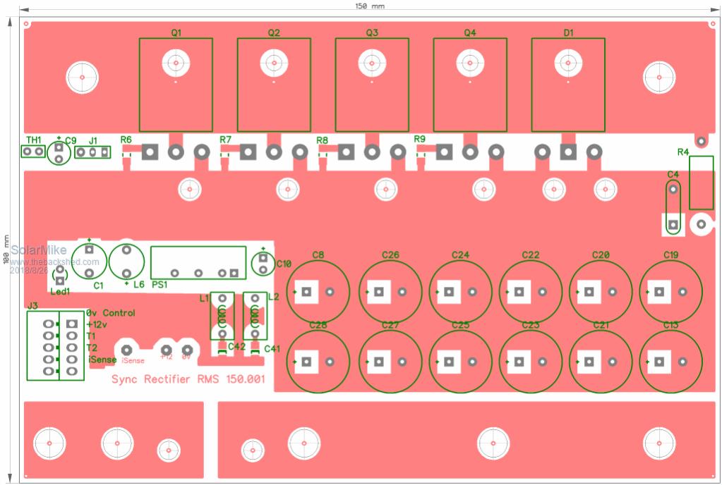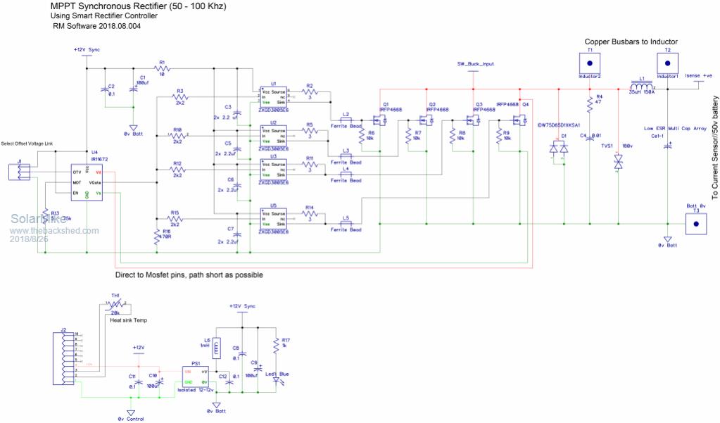 More progress on the synchronous rectifier module: Mosfets mount on an alloy 30x30x6mm right angle as input from the power pwm switch module, no insulators, copper bars bolt to underside bottom end of pcb for +ve output and current sense module, copper bar bolts to source connections mid of pcb as 0volts rail, 12 x 820uf low esr caps used for filtering. Main 35uh inductor bolts from top to bottom of the pcb. IR1672 synchronous controller chip controls the on period of the parallel mosfets for synchronous rectification autonomously of the pwm power stage, so in theory the module could be retro-fitted to any pwm controller to make a mppt controller, with a suitable software change. ![]() ![]() ![]() Its going to be fun making these prototypes, some of the traces are quite small. Edit: C9 has to be moved, its too far away from main 0v rail. Cheers Mike |
