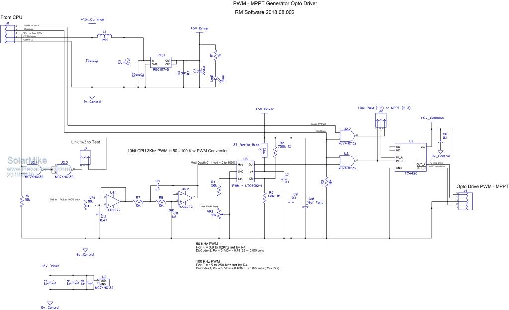 Have made adjustments to the pwm driver schematic, now that the synchronous rectifier is autonomous and has no requirement for a dead-time controlled signal, the driver design can be simplified. The rational for using this driver is to allow 1024 or 10 bit resolution of the pwm output at any frequency, ie. 50 to 100 khz range, unless I go for an exotic cpu this isn't really possible direct from the cpu output. Instead we use a drive frequency that the cpu timers can easily generate with full resolution, generally around 1 - 3 khz is fine. The driver converts the input pwm duty cycle to a voltage between 0 - 1 volts and applies this to a precision pwm modulator chip, by changing a couple of resistors any frequency between 60 hz to 1 mhz can be output. The higher the pwm frequency, the smaller the buck converter choke, of course higher switching losses also occur, thus the suggested max of 100 khz. For mppt operation an extra logic input is provided to enable the static PV isolation mosfets, when only pwm is used (no mppt) the drive signal has a link on the totem driver chip to allow for this mode. ![]() Cheers Mike |