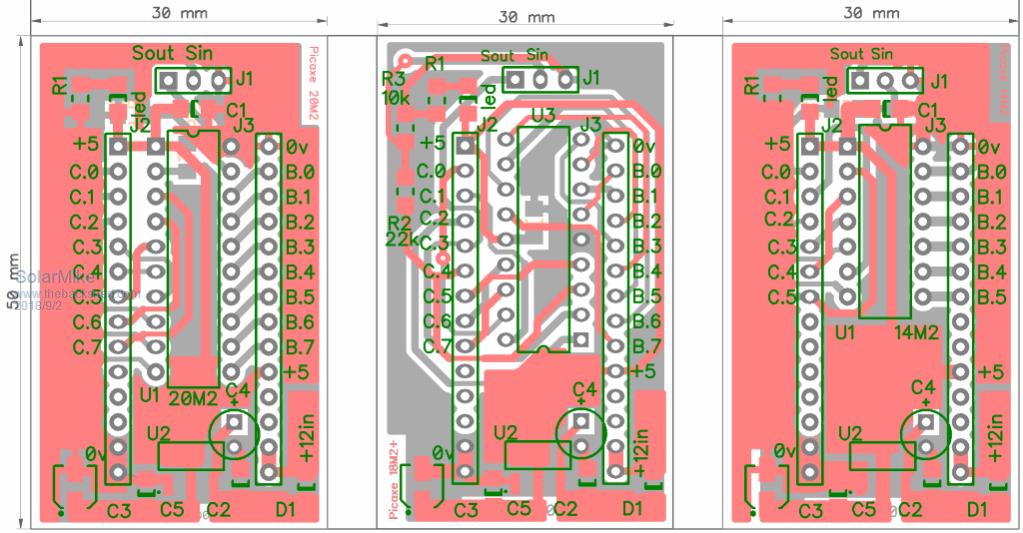 Ok, have reached the point where I need some processing capability to start testing some of these modules; have quite a few Picaxe chips floating around looking for a project or two, micro-mite also looks like a great option, will have to get one to play with, Arduino would also be a candidate except have never used one before. So will start with what I know first, the Picaxe chips all have different pin outs for similar port configuration IO, so what I want is an adapter pcb that has a standardized set of IO pins and a piggy-back socket to plug the pic into, then I can mix and match various chips without having to do a pcb re-design. Have come up with these 3 pcbs that take Picaxe 14M2, 18M2+, 20M2. ![]() Would have thought these or similar would be readily available, not so... Cheers Mike |