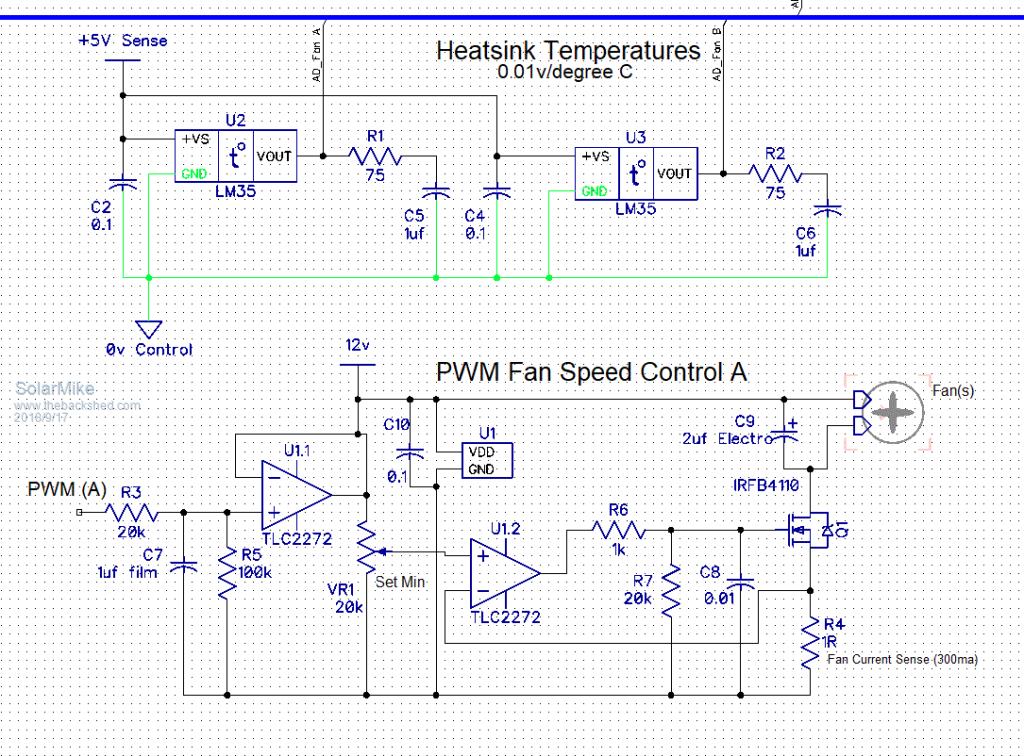 Who would have thought controlling the speed of some fans would be so temperamental, I did try the circuit used in the OZInverter and that works, but it doesn't fit with my design requirement. I need to read the various heat-sink and air temperatures using the PICAxe and make decisions based on the measurement, one of these being to vary the fan speed proportional to temperature, normally I would use a DS18B20 1-Wire device, but using this slows down the PIC to 4 MHz, normally running at 32 MHz and this stuffs up the PWM outputs that are controlling the MPPT switching. Have opted for a LM35 (10mv/degreeC), that works well and seems pretty accurate, allowing the cpu to run at full speed. Those 2 wire 120 - 140mm 12v fans don't like being PWM'd, they make strange noises, so have designed the circuit below, a 7 KHz pwm is input, converted to a voltage to vary the speed in a smooth manner from stopped to full speed, the last op amp drives the mosfet in a linear mode by sensing the fan current using a 1R resistor, for 2 parallel fans use 0.5R If anyone has a better solution, please let me know. Cheers Mike |