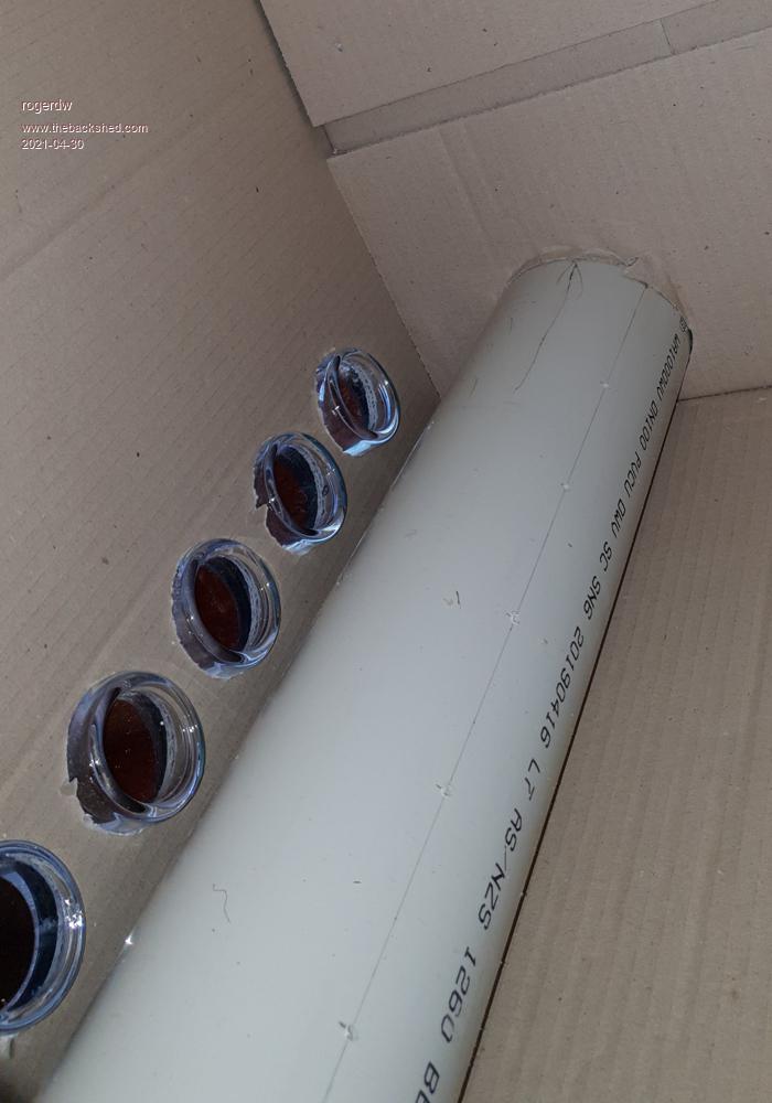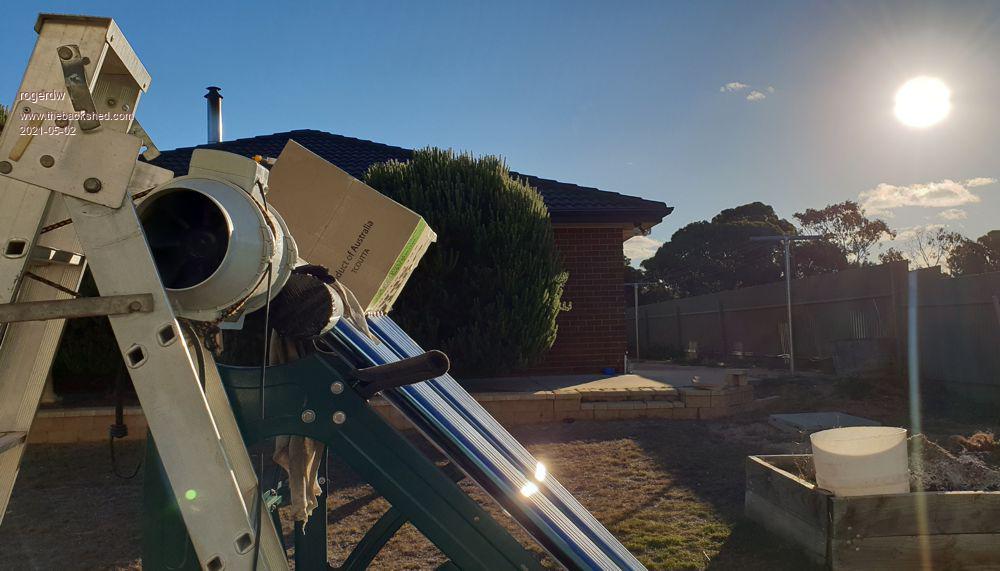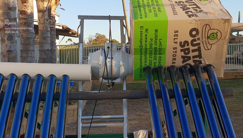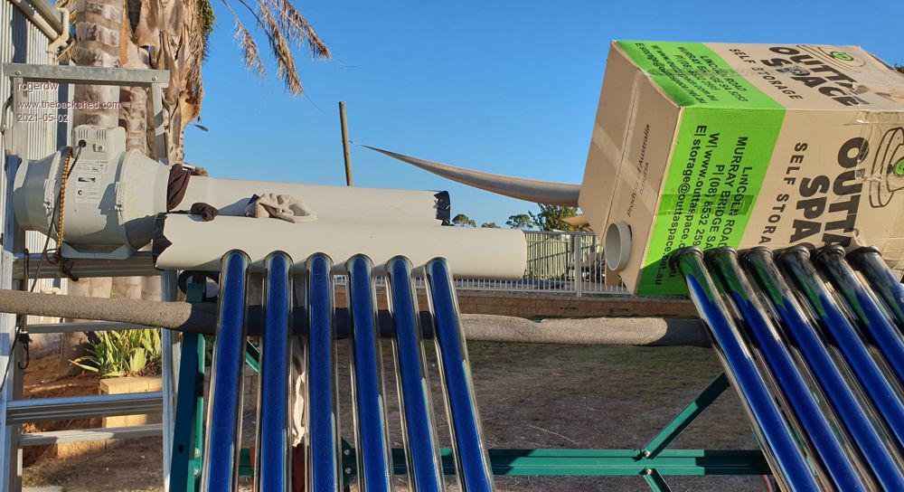 Time for an update. I've been experimenting with various setups and plan for more tomorrow. The following picture is a bit messy but is actually two separate experiments. The one on the right has 6 tubes venting into the bottom of the box and with the cold air inlet on the bottom left. Warm air is meant to rise to the top and be pushed out on the top right hand side. The inlet tube goes all the way across and has holes in the side facing downwards. The idea was to try and limit the colder air from mixing immediately with the warmer air ... and hopefully flow into the tubes as the warm air flows out. Doesn't really seem likely to work ... but I've based it on the fact that many of the cheaper, more basic water heating systems have the pipes directly into the tank ... and as the water is warmed in the tubes, it rises into the tank ... being replaced by cooler water at the bottom. From some of the literature I've read ... the water heating systems that use heatpipes are between 15-20% more efficient than this basic system ... so this should work at least to a degree. The fan is a 2 speed inline exhaust fan that draws 30 watts on low at 467 cubic meters/hr ... and 60 watts on high at 552 cubic meters/hr. I had just got home from Bunnings last weekend where I looked at various fans etc ... sat down with a cup of coffee and was checking out FB Marketplace ... and in the top row were three of these fans ... for $50 the lot. Two 6 inch and one 8 inch. Needless to say I jumped on them quick smart. ![]() This next photo shows the view from through the warm air outlet. You can see the tops of the evacuated tubes ... and the cold air inlet tube, though of course you can't see the holes in the bottom of the tube that spread the cooler air across the bottom. ![]() Cheers, Roger |
