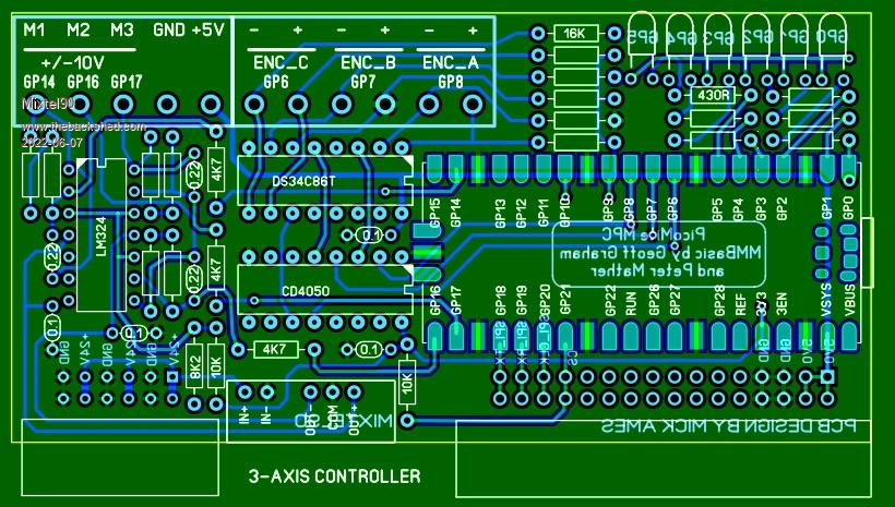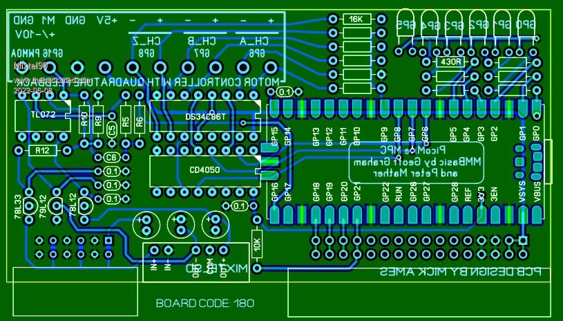 @Mick, I have some comments on the circuit. Please evaluate if these are important enough to change some things. 1/ The RECON 24V->+/-12V convertors do not have feedback inside. They have fixed transformer winding ratings. The +/-12V therefor are inaccurate with the 24V (26 unloaded, 22 loaded). Please check if you use -12V to create an offset for zero'ing the LM324. If so: a/ change the design to use a +/-15V convertor and add LM78L12 and LM79L12 to get stable +/-12V. b/ change the design to use the 3.3V to create an offset required for zero'ing. I can help you with that if needed. 2/ This board is dedicated for an application. You need 3 input channels per output. So with a single 34C86 you need only 1 PMW output = 1 sigle opamp (no need to layout a LM324 that is a quad pack). Worst case I would layout a dual (LM358) to convert 2 PWM to Analog, and connect the 4'th channel of the 34C86 also to the next PIO pin. When the index is not used, you could connect 2 encoders, and drive 2 motors. 3/ The smaller opamp package and removed R's and C's would allow for a better low pass filter (See my TL072 circuit earlier). If you layout that circuit, you could also place the components such that Tinine's classic circuit is used, but also add some components if more speed of resolution is needed. Edited 2022-06-07 16:52 by Volhout PicomiteVGA PETSCII ROBOTS |