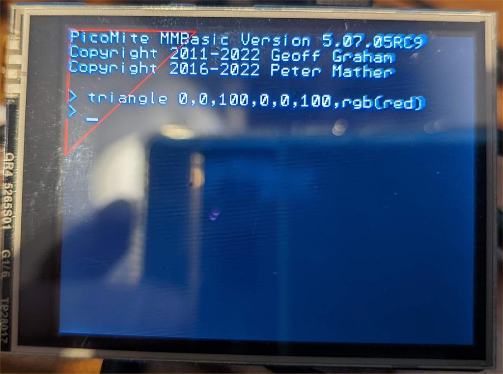 Your code did not "run" on lcd but as you say the errors were not triangle commands. Triangle is not mentioned under drawing commands in the non vga manual but is there in the list of commands, page 118. Lcd is not the same as vga but some games could work but adapting to touch control? I was thinking of android phone games. I do not want to wire buttons to control a lcd game if touch could be used instead. The touch lcd is well implemented and when calibrated is accurate. I will try to adapt vga to lcd but it is fun using lcd graphics with mmbasic. cheers. |