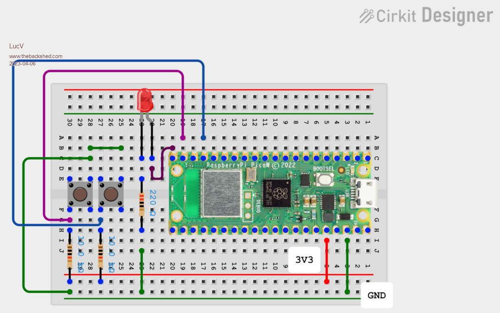 The chapter starts with building a simple setup on a breadboard: a led and 2 buttons.
