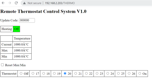 The line, "CODE = 4321" is printed in the program at line 63 with "Print arg$(0,i),"=",arg$(1,i)". The args come via the magic provided by HTML and Peter's code; in the html file, "<input type='text' name='CODE' size='6' value='000000'>" sets the name of the variable, "CODE", and value becomes what you type--4321 in this case. In your browser on the URL line you will see "http://192.168.2.203/THERMO?CODE=4321&RB=R6". After the "?" come the argument=value pairs: "CODE=4321" and "RB=R6". Peter's code strips the "R" off of "R6" and gives a value for the radio button variable of 6.