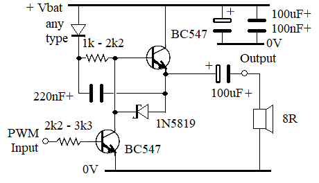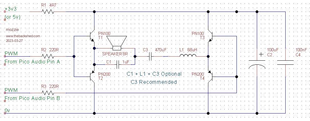 @Bill 220R protection resistors are a great idea, will fit just in case I have tried the circuit with and without filter and the only difference is slightly increased audible hiss without (on 3v3) and higher current draw: current Filter No-filter 3V3 55mA 68mA 5V1 80mA 100mA @Tom Toms_Tunes.zip Above recording is with filter as shown on bridged emitter follower circuit, without filter sounds no different to me but the microphone pics up the carrier and causes problems with recording, so its definitely there PLEASE NOTE: Recording made through my SPL meter microphone as its all I have that'll work with a sound card on this PC, and I know it has filters in it but the output sounds pretty close on playback. Another issue I think is with Play Sound itself, modulation is 25% with 1 sound, 50% with 2 sounds etc. so you only get full output with 4 sounds running. Play Tone and Play WAV are 100% modulation and generate far more output (quite loud) this is what my scope tells me anyway. Regards, Lyle. P.S. I'm running 5.07.07b28 and the speaker is a 35mm / 5w / 8R in a plastic enclosure, probably not much response below 200Hz Edited 2023-03-26 13:45 by mozzie |