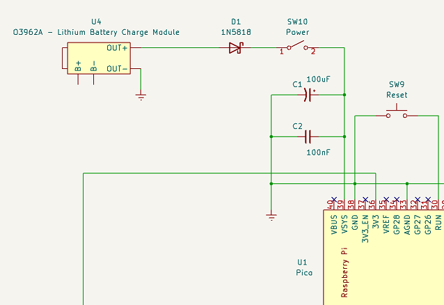 Looks ok, I think. If you find that the volume control is a bit touchy then try adding a resistor in series with C2. That should reduce the gain of the amp, I think. Try anything up to 120k - the higher the value the less gain you should get. The power supply looks ok. If you only want one USB socket exposed you can get a 5V supply to the charger module from VBUS. Just connect it to In+ on the charger. Note that battery -ve does not go to GND, it has to go to B- on the charger. Mick Zilog Inside! nascom.info for Nascom & Gemini Preliminary MMBasic docs & my PCB designs |