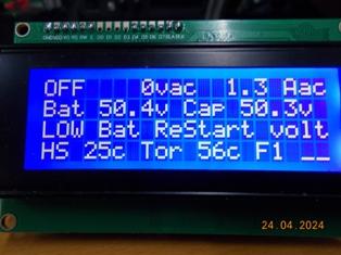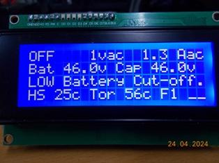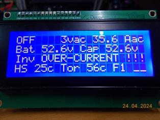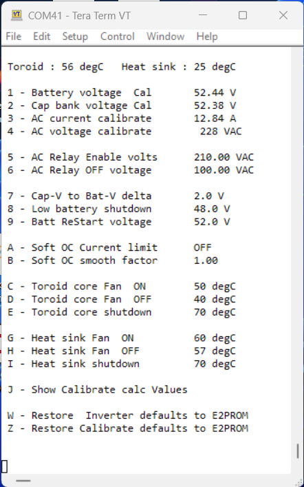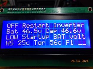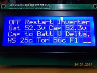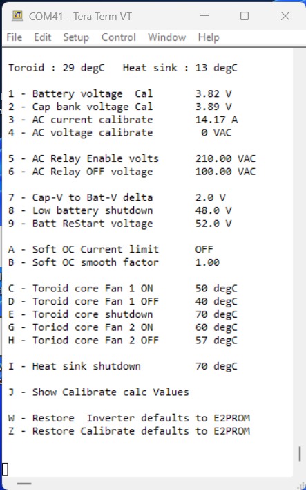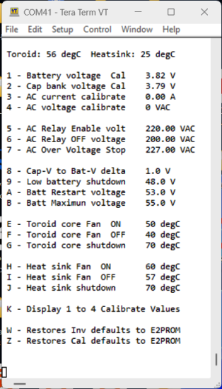 I realized that two things were missing: 1: I did not have an Inverter DC input over voltage setting - actually really important. 2: I've often worried about having a feedback connection or component fault that might possibly cause the Inverter AC output to go really high, so I've added both options to the code. BTW, don't take any notice of the settings, they are set to cause the inverter controller to trip at lower voltages for testing and verifying the LCD information for trip condition is correct. Unless someone comes up with an option they think I missed, this is the final addition to my build of the controller code. FYI The AC relay enable can be set to AUTO (0) = Enable AC relay at the completion of SPWM ramp up. ![]() . Edited 2024-05-04 15:57 by KeepIS NANO:Inverter V 8.2ks - Linux AvrDude GUI script V4.1 |