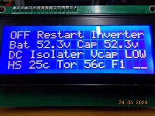 I though I'd run through my error messages and give some idea of things we can do with the Nano. The first message is: "LOW Startup BAT volt" When the inverter is first powered on - the battery voltage should at least be above the Low Battery cutoff setting, if not, you see the messages above and the inverter gives you the middle finger, the LCD top line tells you to "Restart Inverter". "DC Isolater Vcap LOW" At the point of Kilovac enable "for Auto wiring" or, the Main breaker switched to ON and Inverter switched to Run for "manual wiring". At this moment in time, there should be almost no difference between Battery and Cap bank voltage - if there is, you see the above message, possible causes are High resistance / faulty Main breaker or Kilovac wiring or fault, poor inverter wiring etc. "Cap to Batt V Delta" This should never happen unless you have a resistive loss (heat) and this time it's happening under load, so the message above is displayed. It means there is larger voltage drop "Delta setting" between the Inverter battery connections and the Inverter power board Cap bank connections. That could be a wiring fault, terminal connection fault, DC breaker of Kilovac, or other problem. "LOW Battery Cut-off" The battery is below the setting for low battery voltage, this is timed so that short transitions below that point from transient high loads will not trip the inverter, when tripped, the inverter will display the message above, SPWM is ramped down and the inverter waits for the battery restart setup voltage before ramping up and running. "LOW Bat ReStart volt" This message will automatically appear as the battery voltage rises from the previous error above, the inverter will display this until the restart voltage is reached, whereupon the inverter will ramp up and run normally. "LOW AC voltage Trip!" This is mainly to be used with the Software over current setting - NOTE: This has not been fully tested by Poida or myself, it works but can have unforeseen consequences if used incorrectly - Don't use this unless you understand the ramifications for the loads and Inverter without further testing - but I seriously like this and it could be handy if used correctly - to be investigated further. "Software Current ON!" See above error, this indicates that the inverter is varying the PWM duty cycle and lowering the AC voltage to keep the inverter current below the software current setting. The inverter will ramp way down, think Brown Out condition - the Low AC trip above will stop the inverter at the set low AC voltage point. "Toriod C Over-T trip" "Heatsink Over-T trip" Both are obvious, the inverter ramps down and waits for the the inverter to cool down, then ramps back up. "Inv OVER-CURRENT !!!" AC current trip - Hardware OC trip. The over current LED lights, the Reset switch must be pressed to allow the inverter to restart, or the inverter must be powered off and on. Also from DC input current trip using an external current sensor - there is a pin on the controller for this input. "J11 Link = TEST mode" This indicates that the Controller has detected the J11 link is in Test Mode, turn the inverter off before changing the Link. It will be automatically detected and show the message above, or return to normal if the link is removed. In test mode, the Controller will ignore all low voltage conditions - they are not displayed - however it will monitor over temperature settings and will stop SPWM drive until that is resolved. It will Trip on hardware AC over current. It will ramp down on software over current if set, but the LOW AC cutoff is bypassed. Basically the inverter will run from around 13v to 59v. Yes, it will go higher - do you really want to? . Edited 2024-04-25 13:20 by KeepIS NANO:Inverter V 8.2ks - Linux AvrDude GUI script V4.1 |