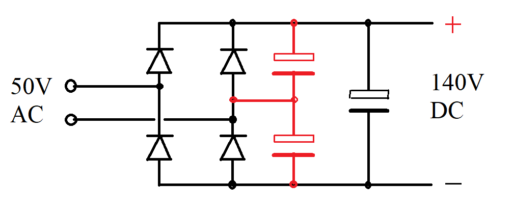 Volhout's voltage doubler can be achieved without the extra diodes. Just connect the common point if the extra capacitors to one of the mains input pads. The 240/120V switch on the back of computer power supplies does the same thing, linking the cap. common point to one mains input. It acts as a regular bridge in the open position and as a voltage doubler in the closed position. |