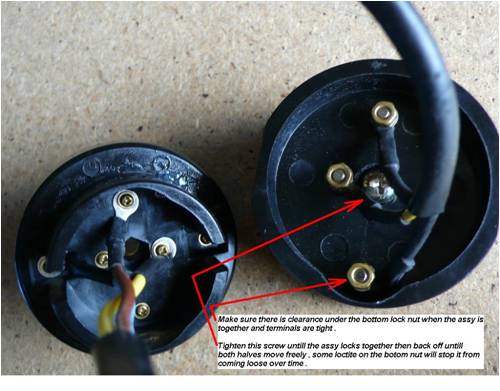 The wire comes up inside the mast and I clamped the mast wire inside the adapter flange, and terminated with a multi wire connector the same as the one in the stator, this allows the head to be disconnected without disturbing the wiring. From this terminal there are two wires per phase going to the underside of the wire slip ring assembly. The next photos are from Phills photo file, Thanks Phill. I used spade terminal for the connectors as they are more substantial than a conventional connector, and they fitted in very nicely with a small trim on the edges to fit them in the slots, on the bottom there are two connectors per slip ring as the connection screws are small it allows two paths for the current from the slip ring. The upper connections use a spade terminal but with a yellow sleeve as this takes the 3mm wire coming from the alternator.