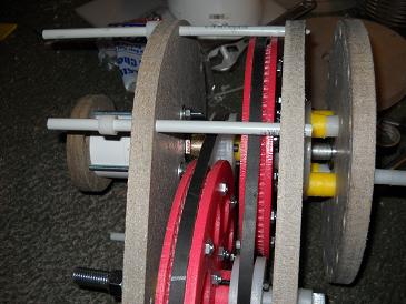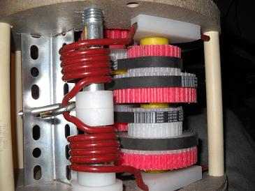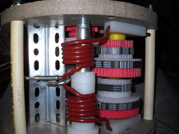 Timing belts and pulleys are installed on a test rig. Because the pulleys are made using two pieces I was able to bevel each piece toward the center of the pulley. This forces the belts to track toward the center of the pulley so a lip is not required. I have to find the correct tool to bend the spring into the correct shape. This a first attempt but it appears to be working. The spring pulls on the top and bottom of the movable shaft and all belts have tension. Again this is a experiment and a learning experience, I do not know how long the belts will last. The next step is to mount it on the PMA and perform a road test. The current configuration is a 1 : 6 ratio.