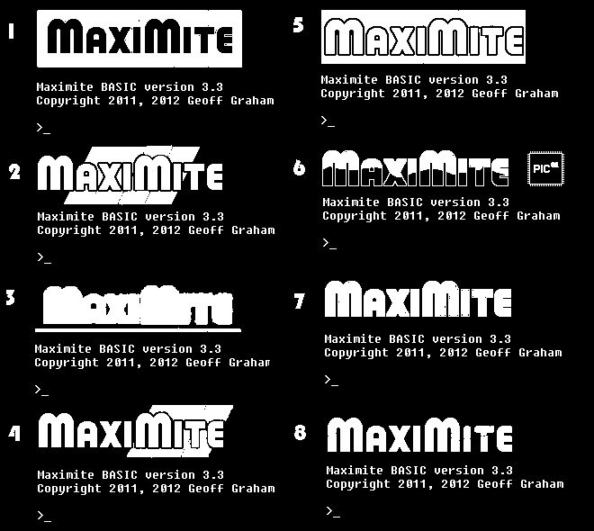 This is my latest collection of possible startup logos for the Maximite. The small graphic of the Pic32 after Logo#6 can be placed on any of the logos but I'm thinking that maybe be should just keep it simple and leave out the extra graphic. My personal favourite is #5. It's very clear and highlights colour.