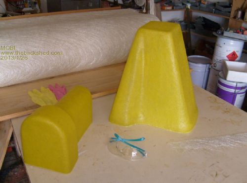 I mentioned that I was doing a bit of fibreglassing - making windmill caps. Here's a couple of snaps - setting on the male mould and off the mould ready for a couple of coats of yellow flocoat resin.