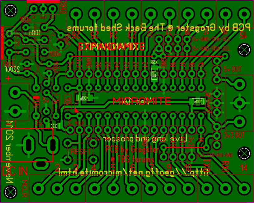 Hi Grogster I hope you take the attached pictures as a compliment to the excellant job you did with the expandamite. Below is my version using your layout. I use a very old program for board layouts, it is called Traxmaker, it was developed for windows from a dos based version. The board is close to your dimensions, all done to a 0.1 grid with a 25mil snap to. Unfortunately I do not have the special cap req for the 170 micro. Anyway here they are.