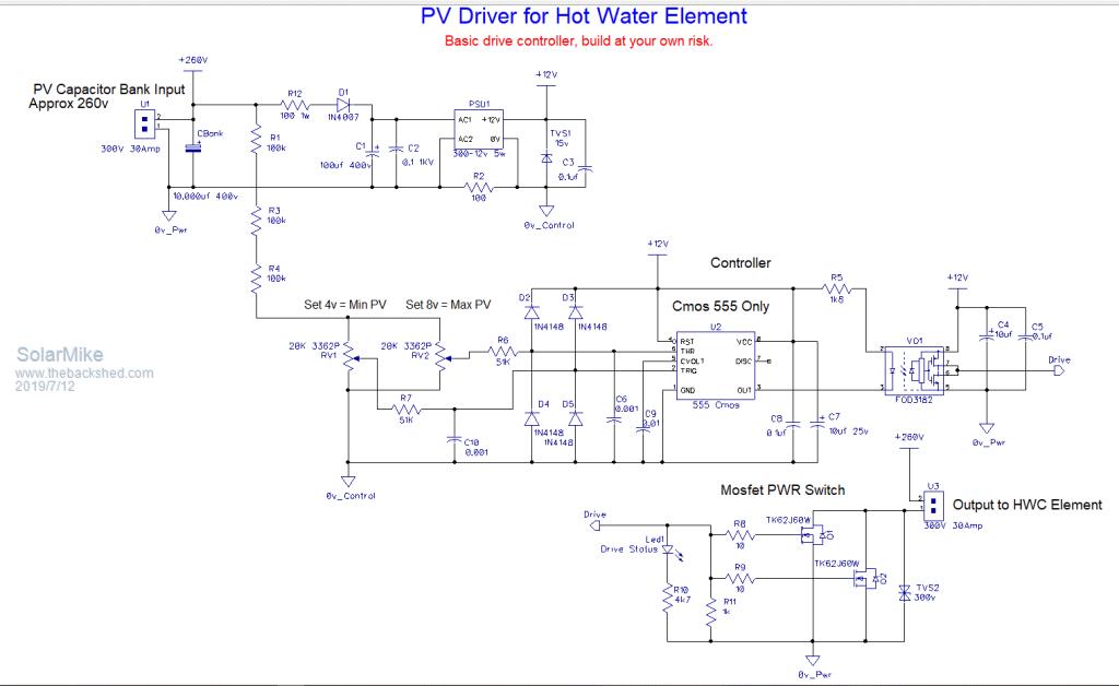 For Dave and others whom want to build the most basic version, I have drawn up a circuit and despite some reservations on how dangerous it is, will also make a pcb design to match. So it is strictly build at your own risk. If anyone sees any obvious errors please let me know. Note this circuit has not been tested live; I have stipulated a Cmos 555 timer chip here as it has a much higher input resistance, it wont work if a normal 555 is used. The optical mosfet driver can be substituted for others of similar spec. Cheers Mike 2019-07-12_163950_Circuit.zip |