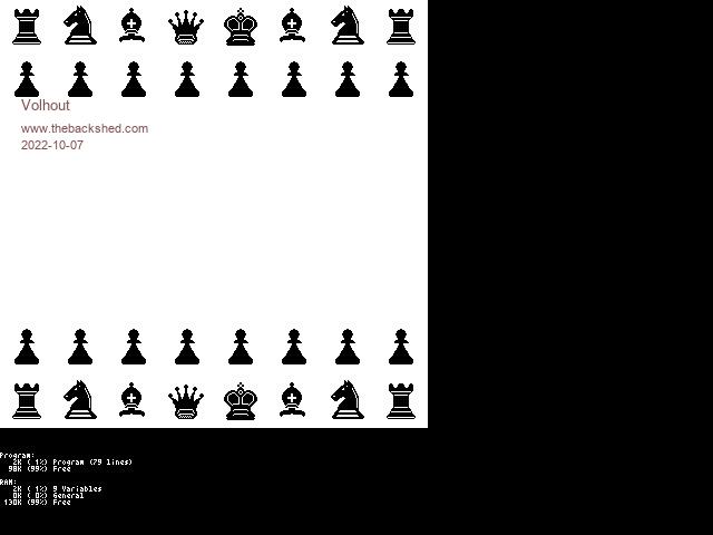Remember you can also use colour in mode 1 using the tile command. If each square on the chess board was 48x48 then your board would be 384x384. Within each square you can have individual foreground and background colours allowing the "black and white" squares and "black and white" pieces each to have different colours |