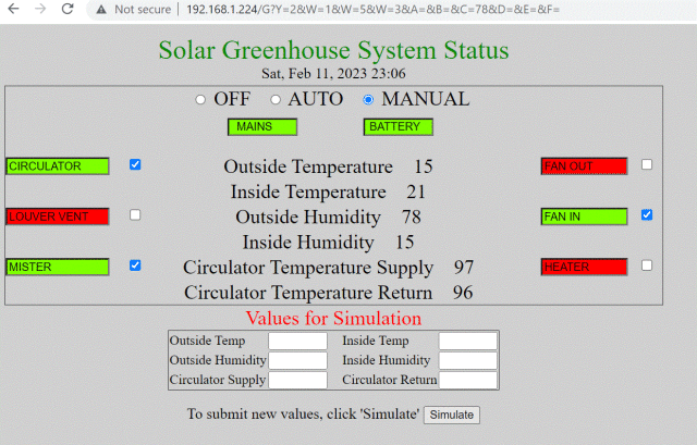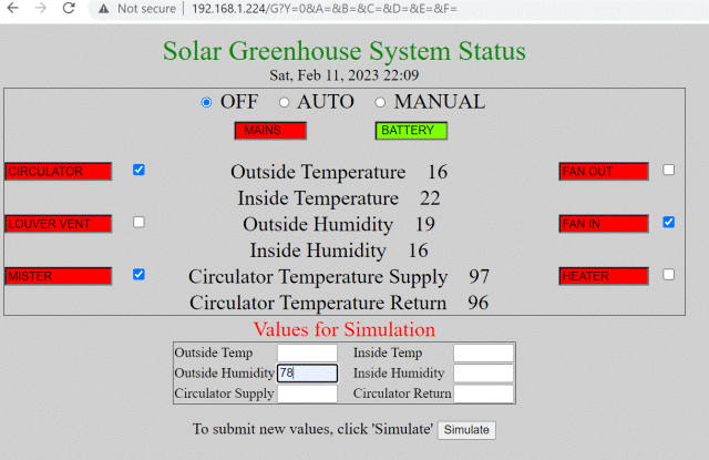 I added 2 DS18B20 sensors, a 6-led module for the outputs, and a 4-button module for the inputs (SETPIN with DIN,PULLUP)--all with flying leads. Here is my hookup diagram: V2.1 40-pin Picomite Pico_W controller 1 | | 40 5V 2 | | 39 5V 0V 3 | | 38 0V 4 | | 37 5 | | 36 3V3 6 | Picomite | 35 7 | I/O | 34 Heater 0V 8 | | 33 0V 9 | | 32 Inside Temp/Humidity 10 | | 31 Fan IN 11 | | 30 [RUN] 12 | | 29 Outside Temp/Humidity 0V 13 | | 28 0V 14 | | 27 Fan Out pLights 15 | | 26 Mister pDoor 16 | | 25 Louver Vent pMotion 17 | | 24 Circulator 0V 18 | | 23 0V Battery ON/OFF 19 | | 22 Circulator InTemp pMains 20 | | 21 Circulator OutTemp If I depress the button for pin 20 (mains detected), check 3 of the boxes for outputs, before I click [Simulate] I get: ![]() If I click "Manual", then release the button, put a value of "78" in for "Outside Humidity", and click [Simulate], I get this, with the MAINS box going from RED to GREEN: ![]() All looking good for me so far. I have to add the input for the door and the output for lights to the HTML template file. (Note the sensor for the battery will be for a 12V solar-charged battery--the PicoMiteWeb will have its own separate battery.) PicoMite, Armmite F4, SensorKits, MMBasic Hardware, Games, etc. on FOTS |