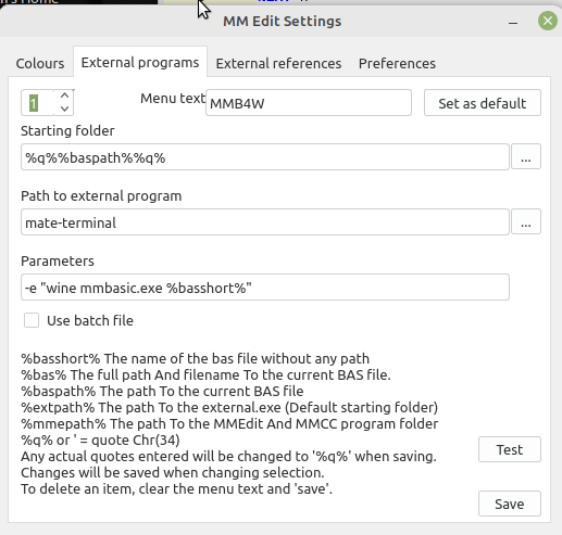I have had some success with launching MMB4W under wine from the Linux version of MMEdit (My Linux is worse than poor so beware) wine can be run from a terminal.Your version of Wine is certain to be different to mine so these notes might not work. On my Mint Mate the terminal is called "mate-terminal" My settings in MMEdit preferences is: Path to external program mate-terminal Parameters -e "wine mmbasic.exe '/home/jim/.wine/drive_c/users/jim/My Documents/%basshort%'" The -e causes wine to be executed when the terminal starts. most terminal incarnations will accept -e I think. I still have to sort out passing the commandline bas program. MMB4W doesn't like the space in "My Documents" and I have not finished playing with quotes to see if I can solve it. The other option is to put my BAS files somewhere in the Wine path that doesn't have bloody spaces. Downloads is a likely suspect. For MMB4L I used. -e mmb4l %q%%bas%%q%&disown Jim Edited 2023-05-21 16:03 by TassyJim VK7JH MMedit |