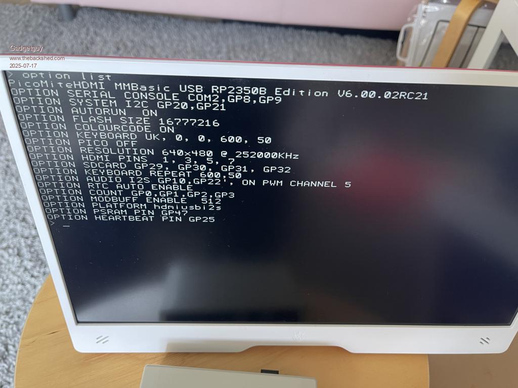 This is what I see now: PicoMiteHDMI MMBasic USB RP2350B Edition V6.00.03 Copyright 2011-2025 Geoff Graham Copyright 2016-2025 Peter Mather > USB Mouse Connected on channel 2 > US USB Keyboard Connected on channel 1 > > option list PicoMiteHDMI MMBasic USB RP2350B Edition V6.00.03 OPTION SERIAL CONSOLE COM2,GP8,GP9 OPTION SYSTEM I2C GP20,GP21 OPTION FLASH SIZE 16777216 OPTION COLOURCODE ON OPTION KEYBOARD US OPTION PICO OFF OPTION RESOLUTION 640x480 @ 315000KHz OPTION SDCARD GP22, GP26, GP27, GP28 OPTION AUDIO GP10,GP11', ON PWM CHANNEL 5 OPTION RTC AUTO ENABLE OPTION MODBUFF ENABLE 192 OPTION PLATFORM HDMIUSB > > > b: > files Error : SD Card not found > |
