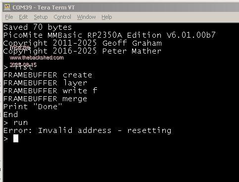 Hi Peter, From other thread:- I've tested the Framebuffer Merge, as it looked like there might be a problem on the 6.01.00b and I do believe there is a problem. I am using :- PicoMite MMBasic USB RP2350A Edition V6.01.00b7 OPTION SERIAL CONSOLE COM2,GP8,GP9,BOTH OPTION SYSTEM SPI GP18,GP19,GP16 OPTION LCD SPI GP26,GP27,GP28 OPTION SYSTEM I2C GP20,GP21 OPTION FLASH SIZE 4194304 OPTION COLOURCODE ON OPTION KEYBOARD US OPTION CPUSPEED (KHz) 360000 OPTION LCDPANEL CONSOLE 7,,, 50,NOSCROLL OPTION DISPLAY 40, 80 OPTION LCDPANEL ST7796S, LANDSCAPE,GP12,GP13,GP14,GP15 OPTION LCD BACKLIGHT 50 OPTION TOUCH GP17,GP7 OPTION SDCARD GP22 OPTION AUDIO GP10,GP11', ON PWM CHANNEL 5 OPTION RTC AUTO ENABLE OPTION DEFAULT FONT 7, 1 The LCD SPI is only connected to the LCD, nothing else. I have tried various CPU speed setting, again, no difference. The simpelest program to demonstrate is:- Framebuffer Create Framebuffer Layer Framebuffre write f Framebuffer Merge 'Or Framebuffer Merge 0 'Or Framebuffer Merge 0,r,100 This will completely lock up the Pico, no output to LCD screen or USB console, though the heartbeat is still flashng, it requires a power off and on. I have done a full Option Reset and manually put everything back in and the problem was still present. Regards, Kevin. Edited 2025-08-15 20:52 by Bleep |