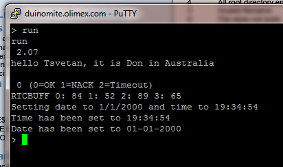 After testing of all types of DuinoMite boards in the USB comms mode, I found the power up message was giving text errors on the additional information about the Olimex port being done by Ken Segler. I tried both PuTTY and MMIDE (which I am starting to like), and found these errors are random and not duplicated, but always it errors. Mick also mentioned this. When I spoke with Ken, he said that it is the USB buffer being too small, and that Geoff will fix this on the next version. Cheers Don... https://www.dontronics.com |